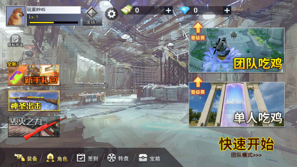 1、安装游戏后进入主界面,领新手礼包,选单人或团队模式,开启挑战。