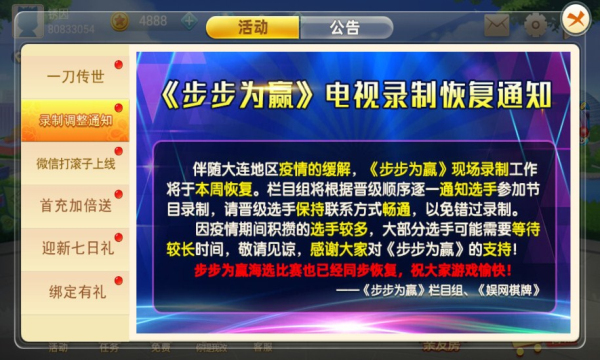 大连娱网棋牌手机版游戏大厅更新日志
