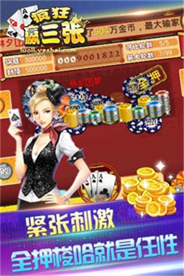 疯狂赢三张是靠谱的三张牌炸金花比大小游戏,可以随时随地赢金币走人,不过炸金花拼的是勇气。